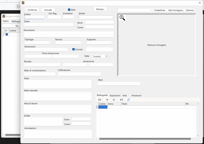 Ogni opera, poi, è presente in Archivio almeno con un’immagine ed è quindi immediatamente riconoscibile e identificabile; tuttavia ad ogni lavoro è possibile collegare diverse immagini, a risoluzioni differenti, che potranno essere poi utilizzate per pubblicazioni su web, cartacee, ecc… Infine ogni scheda delle opere presenta due campi liberi per le Note e le Note riservate, dove trovano spazio le più diverse informazioni legate al lavoro in oggetto; le Note riservate, in particolare, contengono informazioni importanti ma che non vanno diffuse (ad esempio i nomi dei destinatari di una dedica) e uno Area di lavoro, utile per ricordare al compilatore eventuali questioni in sospeso e da controllare.
